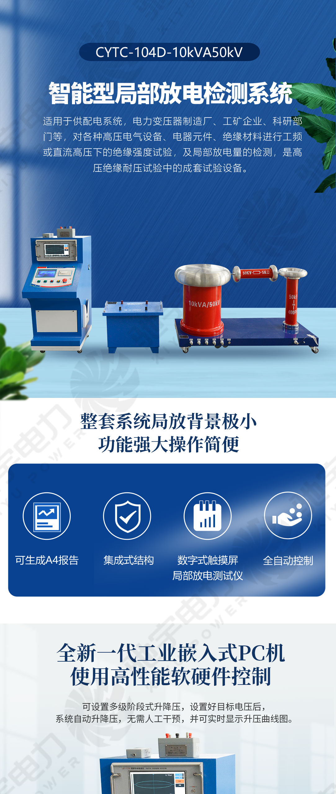 局部放电检测系统 CYTC-104D-10kVA/50kV,适用于供配电系统,电力变压器制造厂、工矿企业、科研部门等,对各种高压电气设备、电器元件、绝缘材料进行工频或直流高压下的绝缘强度试验,是高压试验中的重要设备。巧妙的将无局放试验装置(变压器控制部分)和局部放电检测仪结为一体,外观亮丽轻巧,使测试过程更加方便简单。